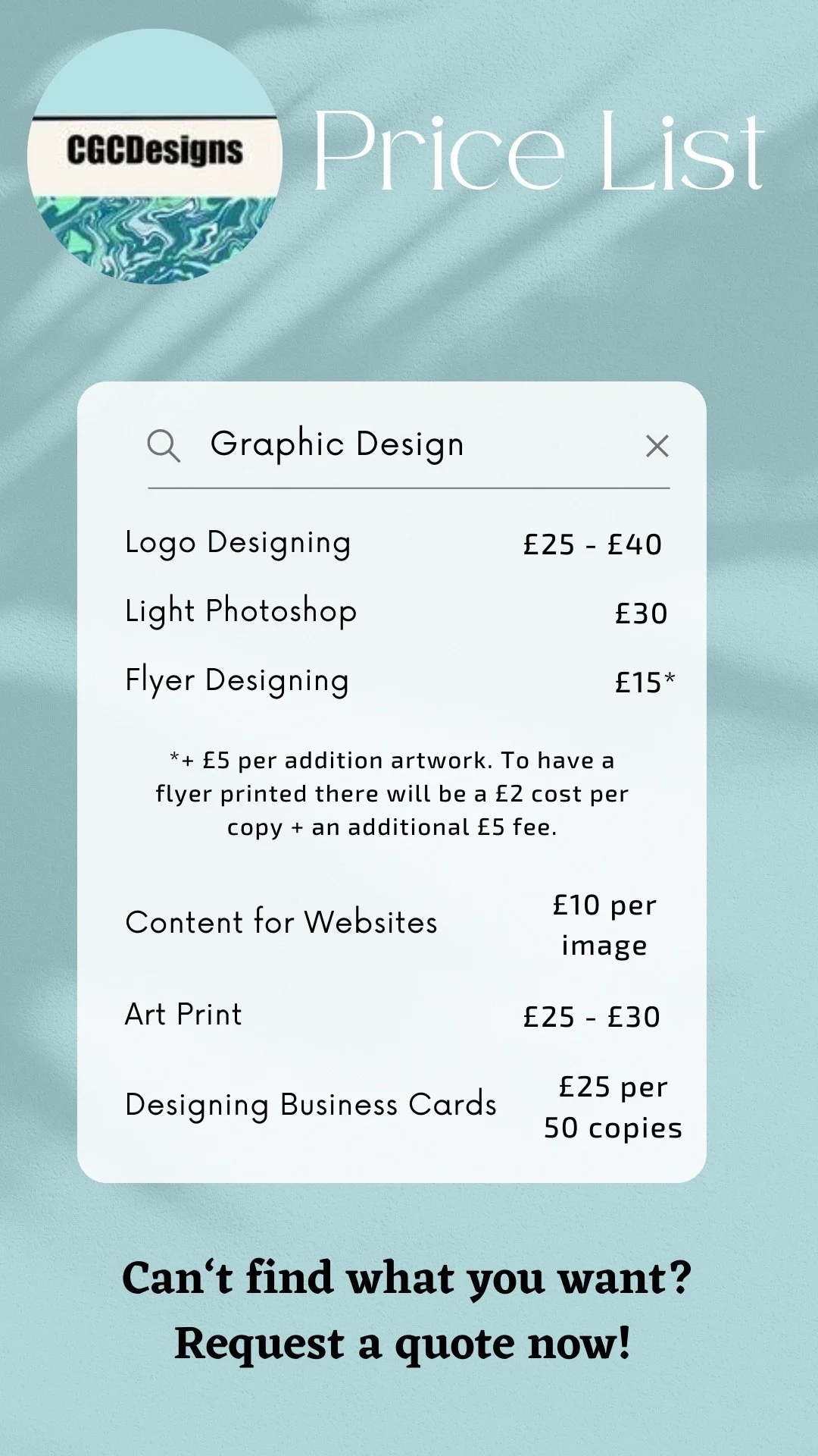 Graphic design services are essential for businesses, organizations, and individuals looking to create a strong visual identity. These services include logo design, print design and more. A well-designed logo can make a lasting impression on customers and help establish brand recognition. Print design encompasses everything from business cards to brochures and can help businesses stand out in a crowded market. Here at CGCDesigns we can ensure a cohesive and visually appealing brand image when you work with us.